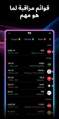 اكتشف عالم الأسواق المالية بكل تفاصيله الدقيقة مع TradingView، بوابتك الشاملة لذكاء استثماري لا مثيل له. يزودك TradingView ببيانات لحظية وموثوقة من مقدمي خدمات محترفين، مما يمنحك وصولاً مباشراً إلى تقلبات أسعار الأسهم، العقود الآجلة، المؤشرات الرئيسية عالمياً كـ NASDAQ Composite وS&P 500، بالإضافة إلى سوق الفوركس والعملات الرقمية والعقود مقابل الفروقات. تتبع أسعار النفط، الذهب، السندات، الصناديق الاستثمارية، والسلع المتنوعة، لتبقى على اطلاع دائم بكل ما يؤثر على قراراتك الاستثمارية.
