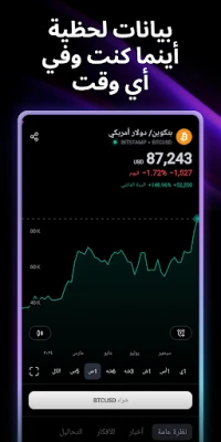 استمتع بمزامنة حساباتك بسلاسة، حيث يمكنك الوصول إلى جميع التغييرات، الإشعارات، الرسوم البيانية المحفوظة، وأدوات التحليل التي استخدمتها على منصة TradingView من أي مكان. يوفر التطبيق بيانات لحظية لأكثر من 100 ألف أداة مالية من أكثر من 50 بورصة عالمية رائدة، تشمل بورصات الولايات المتحدة، الشرق الأوسط، آسيا، وأوروبا مثل NYSE، LSE، NASDAQ، وغيرها الكثير، مما يضع قوة الأسواق العالمية بين يديك.